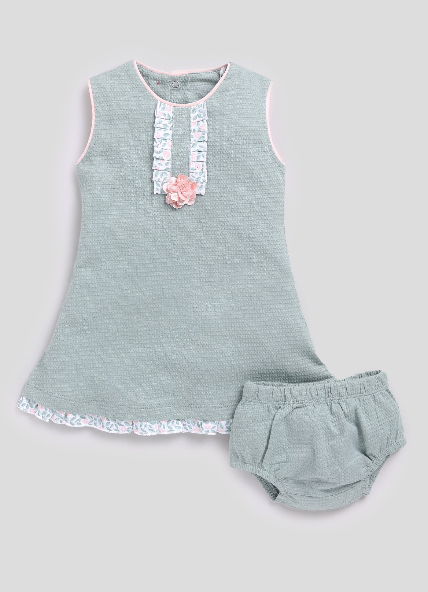- The baby frock boasts a comfy round neck and handy buttons for fuss-free dressing, while the panties feature a gentle waistband and pull-on design for quick diaper changes.